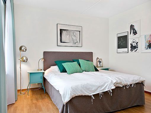Austero y funcional, los tonos neutros son la base de la decoración de este dormitorio. Las mesillas y los complementos son los que elevan un poco el tono. El cabecero de tela va a juego con los faldones de la cama. Un toque vintage en la lámpara de pie y un poco de romanticismo en las ciadas de la ventana. Un cuadro central y un composición simétrica de láminas enmarcadas restan sobriedad al ambiente.