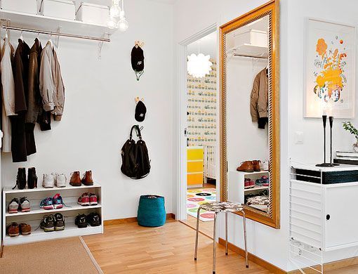 Al tener altura de sobra se creó un armario a la vista con repisas, perchero, perchas en vertical y mueble bajo para zapatos. Frente a la puerta, destaca un gran espejo, ideal para echarse ese último vistazo, imprescindible antes de salir de casa. Un sencillo taburete sirve lo mismo de apoyo para quitarse y ponerse los zapatos como para maquillarse antes de salir de casa.