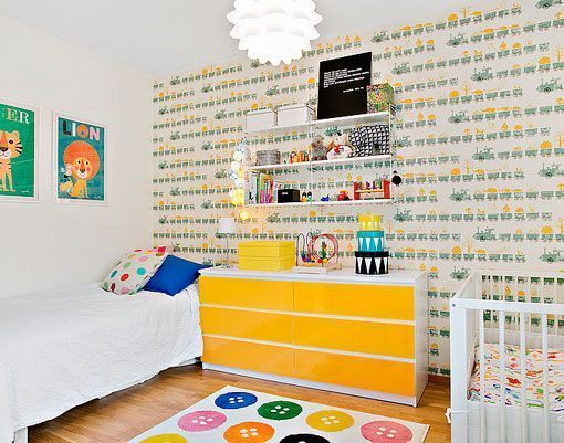 Ubicado frente a la puerta de entrada, la habitación de los niños es el único espacio de la casa donde los colores alegres se hacen patentes. Al ser un espacio cuadrado, cama y cuna se pegaron a la pared para dejar un espacio central suficiente para sus juegos. La pared del cabecero se empapeló con un modelo de trenecitos verdes y amarillos. Baldas y cómoda de Ikea completan su decoración