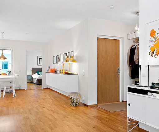 La estructura rectangular y la situación de sus dos terrazas, han sido clave en la distribución de los espacios de esta casa de 80 metros cuadrados. De planta casi diáfana, la casa se plantea en dos zonas separadas por un amplio y cómodo pasillo central. Con la puerta de entrada en el centro, a un lado se ubicó el salón; y en el lado opuesto se situó la cocina con comedor y el dormitorio principal. Mientras que el dormitorio infantil y el cuarto de baño quedan enfrentados en la parte central. El blanco marfil utilizado para pintar techos y paredes, el suelo de madera de roble y las tapicerías en tonos suaves contribuyen a crear ambientes cálidos y funcionales, decorados con muebles de líneas actuales.