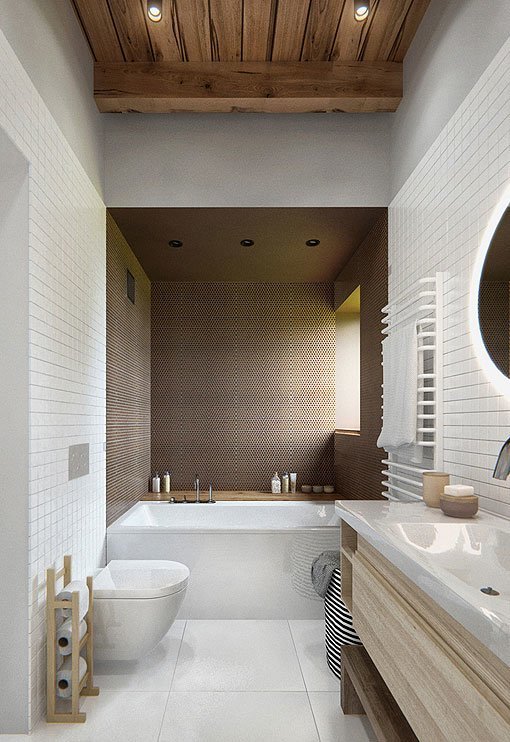 En el cuarto de baño principal se apostó por una estética actual, moderna, contemporánea con el mismo aire escandinavo que domina en toda la vivienda. Sin duda, el gran atractivo de la decoración es el contrastes de texturas, materiales y colores que combinan a la perfección: revestimientos cerámicos en blanco, gresite en color chocolate en la zona de la bañera, superficies de madera clara, techo de viguería vista de madera envejecida...
