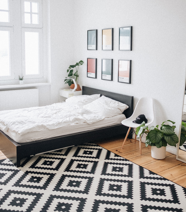 Puedes hacerlo con vinilos autoadhesivos, que no necesitan cola ni ningún otro material adherente, sino que basta con despegar su parte posterior y pegarlos en el suelo como si fueran una pegatina o un vinilo decorativo de pared. Como puedes comprobar en este dormitorio, el resultado es impactante.