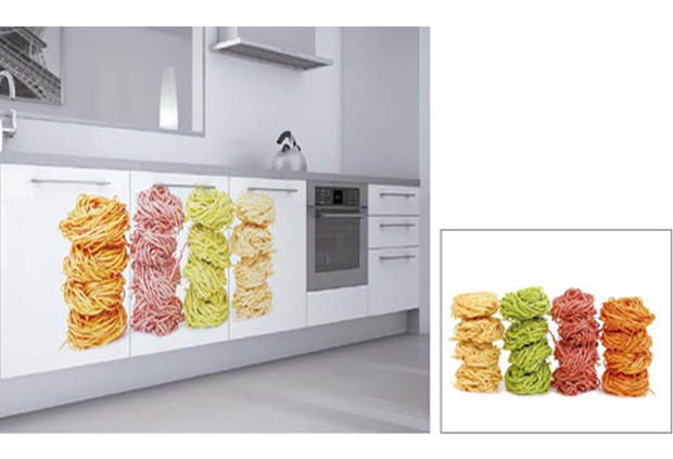 Puedes imprimir los motivos que más te gusten: fotográficos, paisajes muy tenues o desdibujados… que no lleguen a cansarte; puede ser también un dibujo hecho por ti. Por favor, nada de cebollas, ni tomates, a no ser que sean unas fotos realmente de diseño. ¿Qué te parece este diseño con estos decorativos espaguetis de colores para tu cocina?