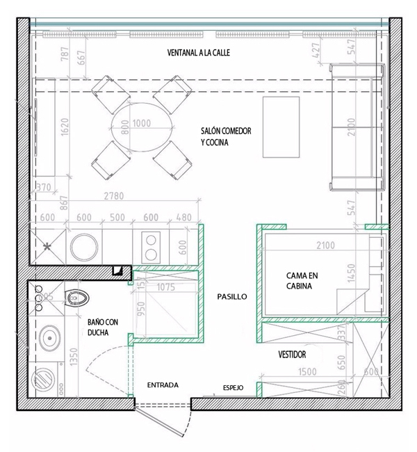 Configurado como un ambiente diáfano, el estudio está formado por espacios contiguos: el salón, el comedor y la cocina, así como una cabina abierta en la que se encuentra la cama, solo el baño está aislado para mayor intimidad.