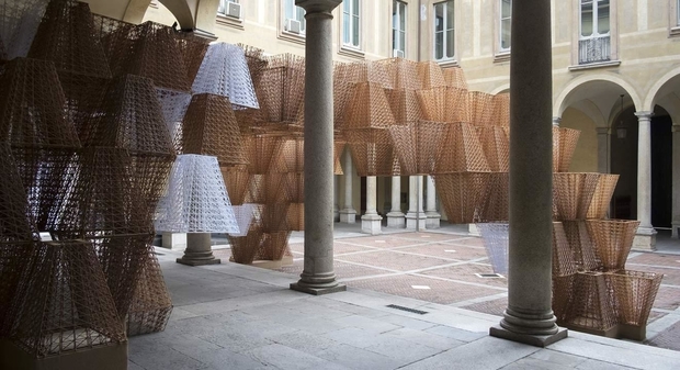Este año, la firma de moda COS, una marca del grupo H&M, se asoció con el arquitecto francés Arthur Mamou-Mani para crear una estructura realizada con 700 ladrillos de plástico bio, que medía 30 metros de altura. Se instaló en el patio del Palazzo Isimbardi, un palacio del siglo XVI.