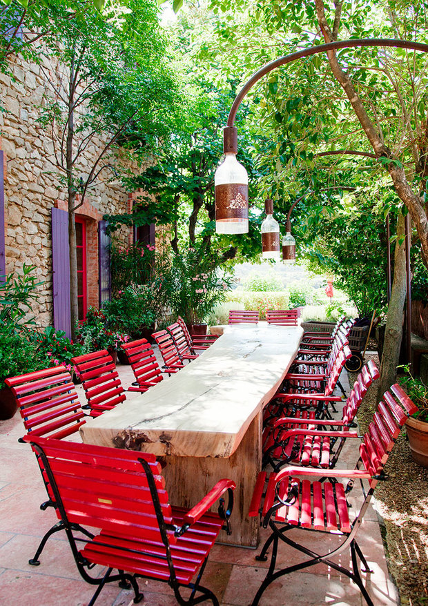 De este otro lado del Mediterráneo (Italia, Francia, España...) encontramos espacios ligeramente diferentes. Lo que nunca falla en estos exteriores son las mesas de comedor, incluso por delante de tumbonas. La mesa para las cenas de verano es sencillamente irremplazable. Las construcciones suelen priorizar la piedra y, según la zona, los jardines bien cuidados aportan el marco verde. También son frecuentes las albercas o pequeñas piscinas, que dan frescor y humedad al jardín. Al ser espacio estacionales, que no se usan todo el año, el mobiliario suele ser de quita y pon, a diferencia de otras latitudes.