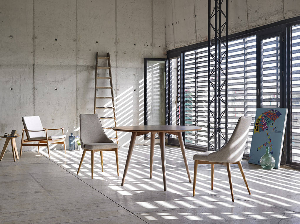 Ligera y elegante, toda la colección Loft Tendencia tiene una clara inspiración en el diseño nórdico, e incluye, además de una mesa redonda de 120 cm de diámetro, sillas tapizadas, una butaca estilo años 50 y un coqueto taburete que sirve también de mesa auxiliar. Todas las piezas están realizadas en madera de haya o de nogal.