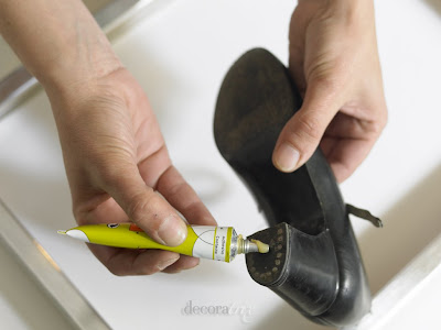 4. Una vez aplicado el pegamento a los zapatos, lo componemos y pegamos.