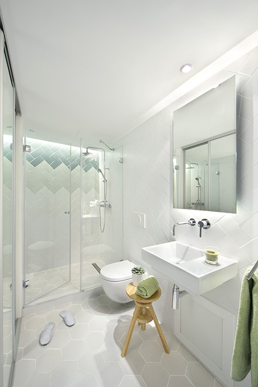Para preservar la necesaria privacidad, cada uno de los dormitorios cuenta con su propio baño. En uno de ellos, se repite el pavimento de baldosas hexagonales, aunque esta vez en color blanco, ya que este espacio no cuenta con luz natural. Junto a ellas, los azulejos colocados de forma oblicua de las paredes añaden una nota diferente y personal. En la ducha se ha jugado con el doble degradado de la iluminación y de las tonalidades del alicatado. Las superficies recubiertas de espejo multiplican la luminosidad de este espacio. Una segunda residencia que a muchos nos gustaría tener como primera. Fotografías: Vicugo Foto.